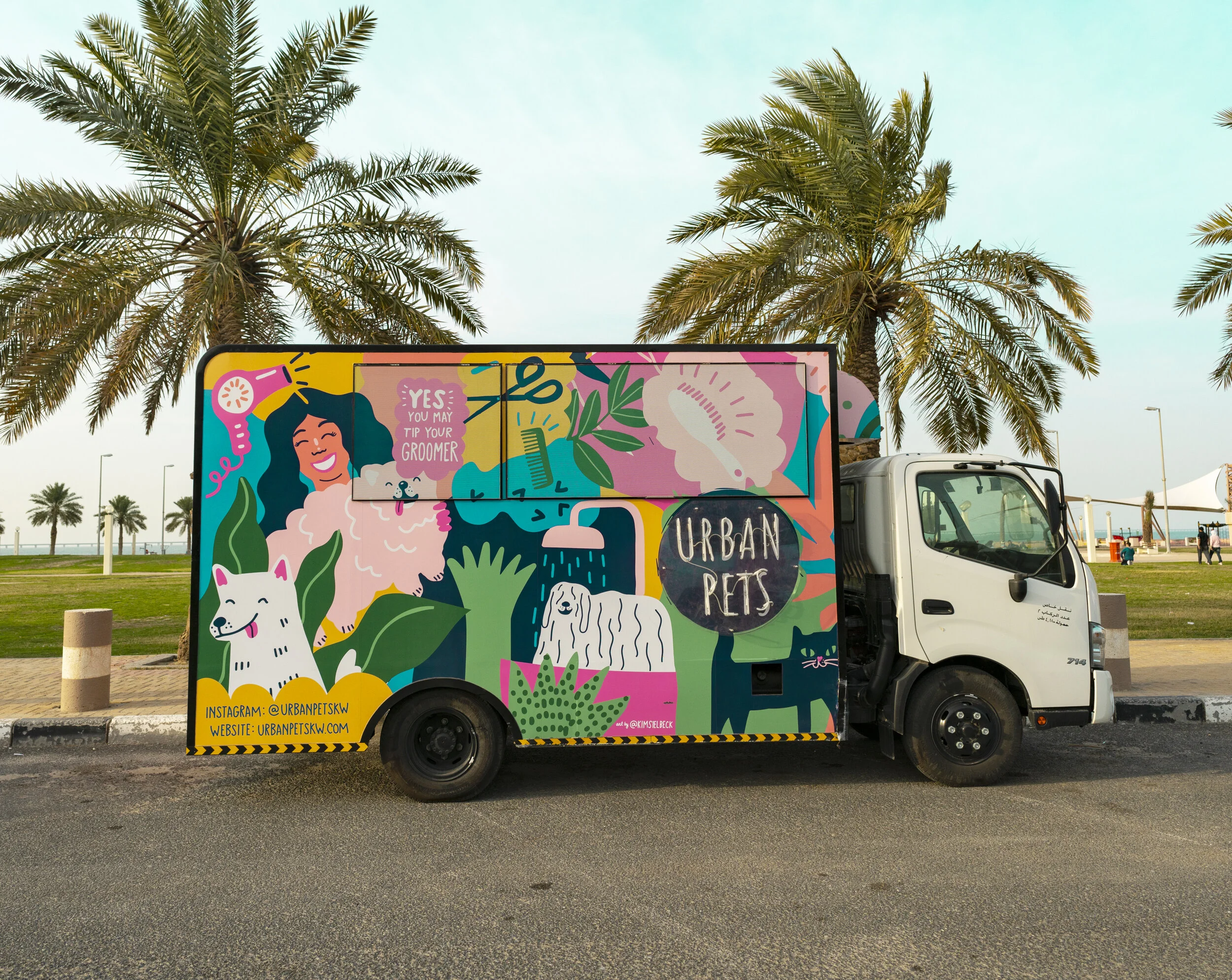 Illustrations for Urban Pets KW, a full-service pet salon on wheels located in Kuwait.